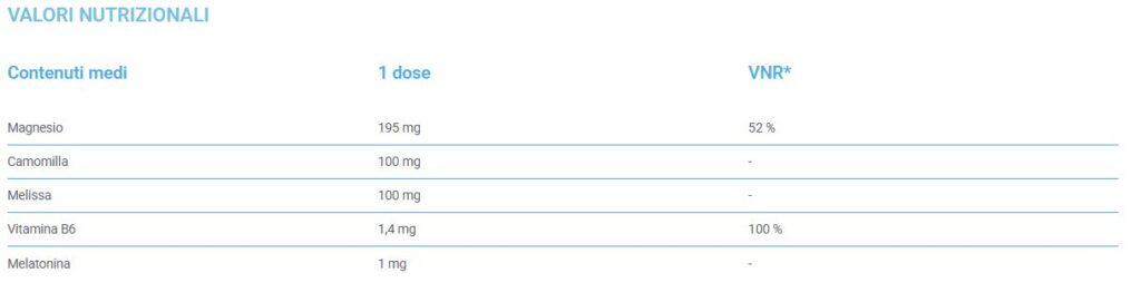 Magnesio Supremo® Notte Relax è una formula dalla duplice azione, infatti è indicata: per quando si ha difficoltà ad addormentarsi grazie ai benefici della melatonina e per il rilassamento mentale grazie alla presenza di camomilla e melissa.